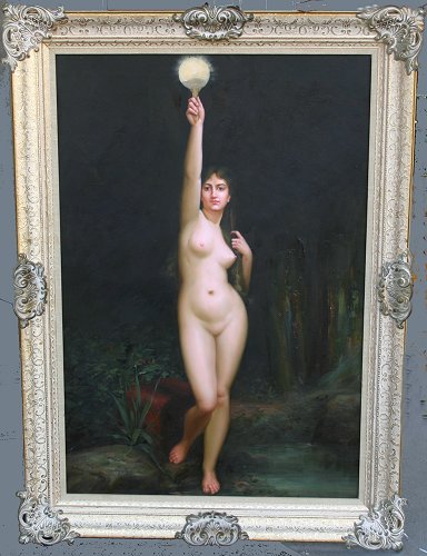 DECORATIVE 20TH CENTURY DEPICTION OF THE NUDE COLUMBIA: O/CB, 35 1/2'' X 24'', encased in a decorative metal accents, circa 1970.