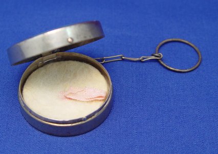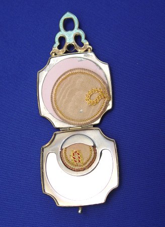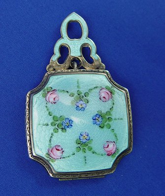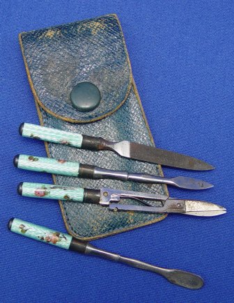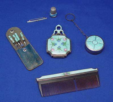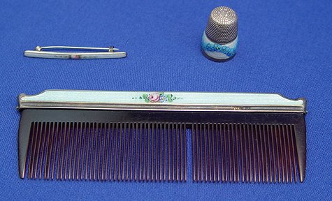 ESTATE LOT OF GUILLOCHE OBJECTS OF VIRTUE: To include, sterling compact by La Mode, floral accents to hinged lid, two tiny puffs inside, guilloche to shaped handle with matching design in silver verso, 2'' x 3 1/4'' overall. Matching comb, missing one tooth and slight chips to one end of enameling on each side, 4 5/8''l. Tiny bar pin marked Sterling & H in triangle, floral design on white ground, 1 3/4''l. Small round compact of silver over copper, most of plate gone, sectioned guilloche top, on chain with ring end, 1 1/2''dia, 5''l. overall. Thimble with enamel band, marked 830, three crowns in a circle and an S. And a diminutive four piece German Sterling and guilloche nail set. Set includes scissors, file, cuticle push and scraper, adorably tiny in its own leather case. Sold as a lot.