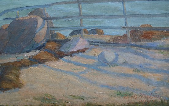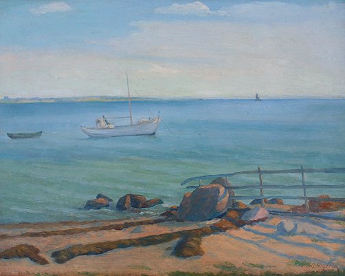 MADSEN, Niels, (Danish, 20th C): Harbor scene, O/C, 20'' x 26'', signed lower right dated 1947, also titled illegibly verso and signed/dated on the stretcher, encased in the original gilt frame with wear 23'' x 29''. Condition - Needs cleaning, some craquelure, several small flecks of paint loss, good overall.