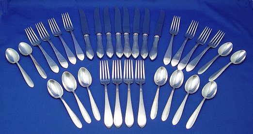 STERLING FLATWARE: 31 pieces of a blended service. 12 Dominick & Haff ''Broad Antique'' dinner forks. 8 sterling handle dinner knives, and 11 Manchester ''Pilgrim'' teaspoons.