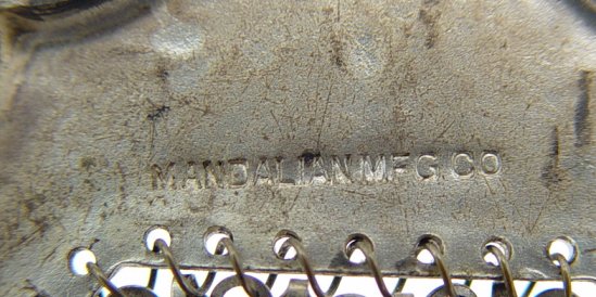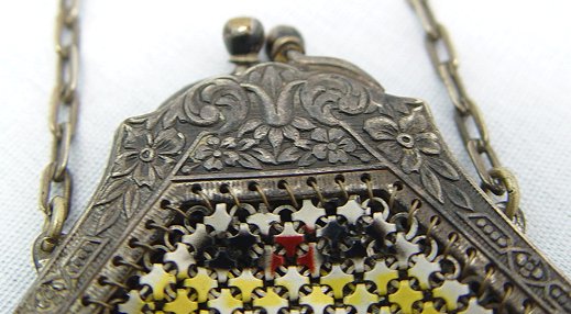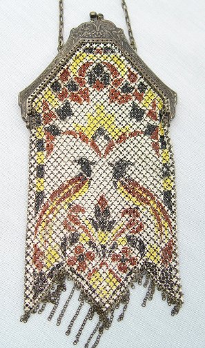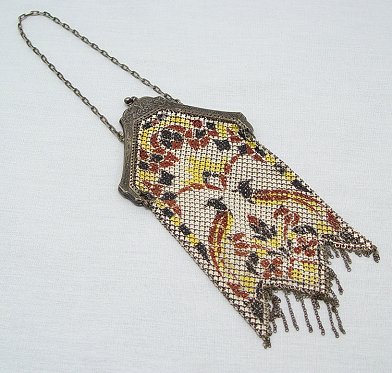 VINTAGE MANDALIAN BIRD OF PARADISE ENAMELED MESH PURSE: Black, brown, and yellow coloration. Chain fringe. 6 1/2''h., 3 1/2''w.