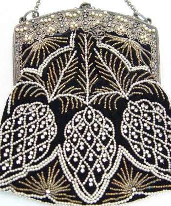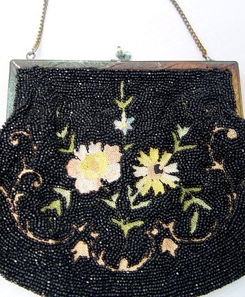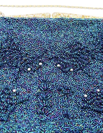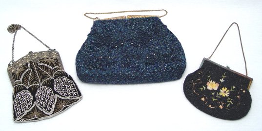 TWO FRENCH BEADED PURSES PLUS: Black beaded and embroidered purse, 5''l. and a beaded and rhinestone on velvet bag, 6''l. Both bear French labels. Sold with a midnight blue iridised beaded purse with a Hong Kong label, 7''l. All have chain handles and tight clasps.