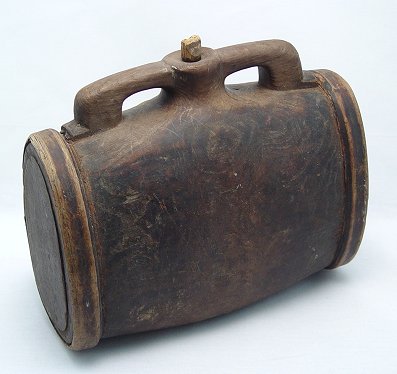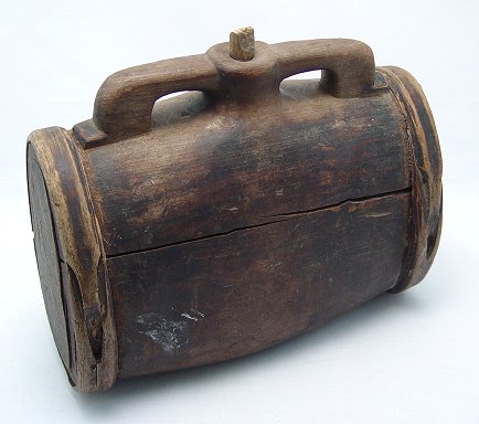 AN EARLY WOODEN CANTEEN possibly Civil War Era: All wood construction. Handle and body are carved from one piece of wood. Wood banding and stopper. 10 1/2'' x 8''.