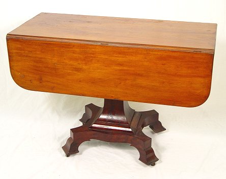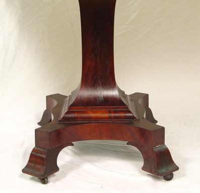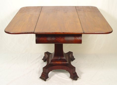 EMPIRE PERIOD MAHOGANY DROPLEAF TABLE: Single pedestal, flame grain mahogany. 29''h. x 42'' x 19'' with leaves down, surface 42'' x 42'' with leaves extended.