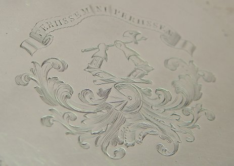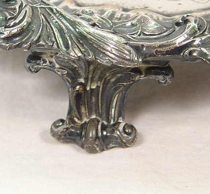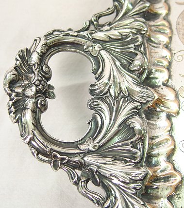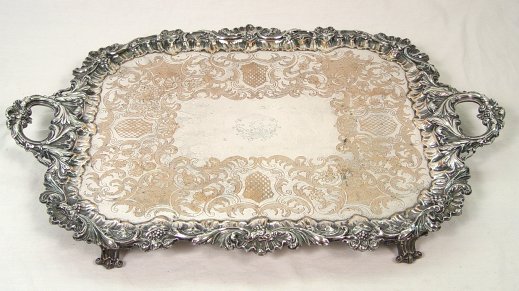 A HEAVY SILVERPLATED SERVING TRAY: Grape, scroll and leaf embossed border centers a coat of arms ''Perissem Ni Perissem''. Open handles, scrolled feet. Copper shows through front surface. 30'' x 19''.