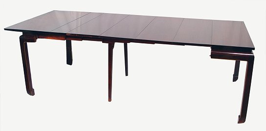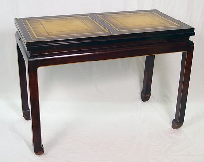 CLASSIC CHINESE STYLE SIDE TABLE CONVERTS TO DINING: With 4 leaves the table opens to 94''l. 42''w. Mix of light and dark mahogany. Second half 20th C.