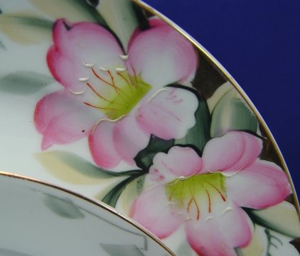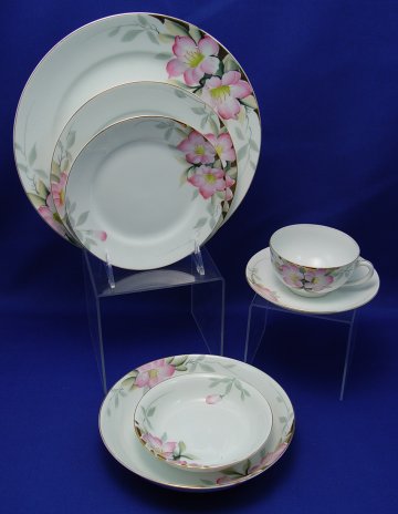 NORITAKE ''AZALEA'' PATTERN FINE CHINA SERVICE: 40 piece service for six to include 6 dinner plates, 6 salad plates, 6 bread plates, 6 cups with 5 saucers, relish tray, nappy, butter tub with insert, and the condiment tray with mustard, salt and pepper shakers.