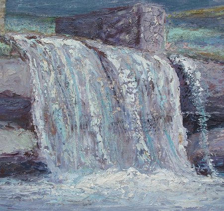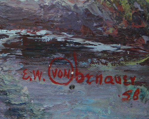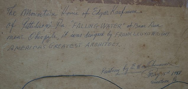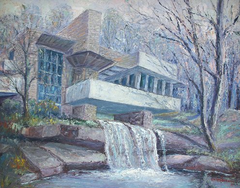 OBENAUER, E.W., (American, 20th C.): Mountain home of Edgar Kaufman know as ''Falling Water'' designed by the world famous American architect, Frank Lloyd Wright, O/B, 24 x 30'', signed lower right and dated 58', also inscribed verso with title, artist signature and date Union Town, Pennsylvania. Condition - Scattered speckling of paint loss throughout.