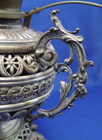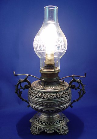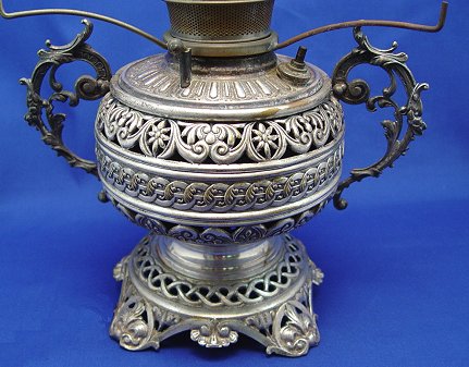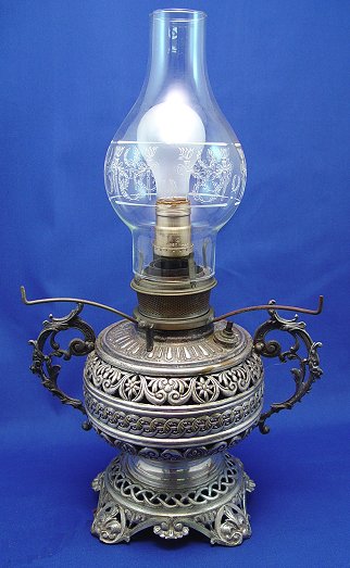 BRADLEY & HUBBARD FANCY OIL LAMP: Silvered pierced body, will support an 11'' dia glass shade. Converted to electricity. Embossed B&H on the font, 5448 on the base. 10''h.