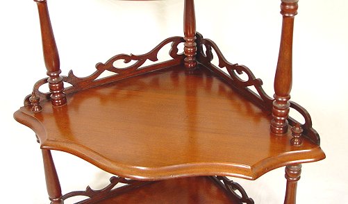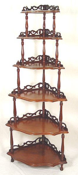 WALNUT VICTORIAN CORNER ETAGERE: Six tiers of open graduating shelves. Shaped fronts, pierced galleries. Excellent condition. 66''h.