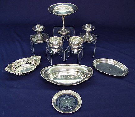 ESTATE ACCUMULATION OF STERLING: 9 pieces to include Stieff oval dish, 10''l, Gorham reticulated oval dish, 8 1/2''l., International tray with Hamilton creamer and sugar, all monogrammed B, a pair of Gorham candle holders, 4''h., a sterling compote, 6''h. an Alvin round dish with repousse border. 5 3/4'' dia.