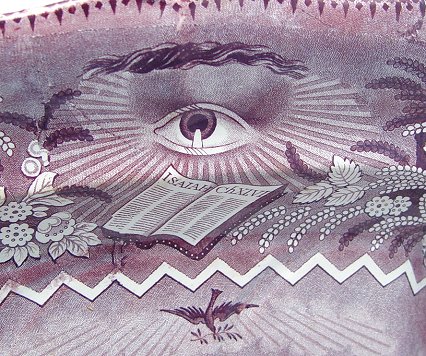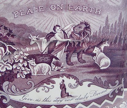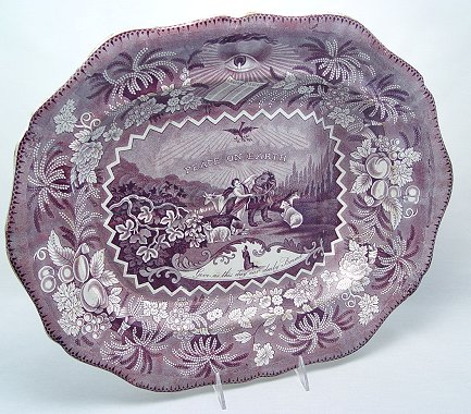 19th C STAFFORDSHIRE ''MILLENNIUM'' TRANSFERWARE PLATTER WITH WELL: Rare purple color, 18 1/2''l. x 15''. Ralph Stevenson, Ca. 1823-1835. The words on the platter read ''Peace on Earth Give us this day our daily Bread'', the bible page is opened to Isaiah Chapter XI, VI. Very good condition with little wear along the edges and minor chip on the built in base. Est. $450/600**