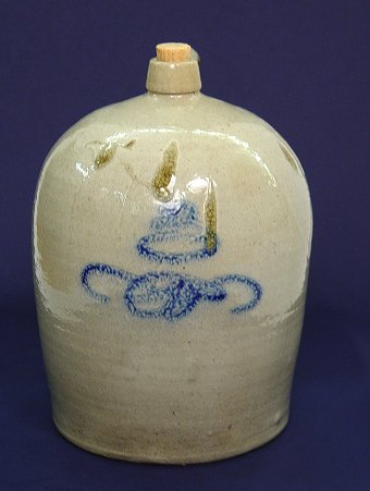 LARGE STONEWARE JUG: Stylized cobalt decoration to front, no mark found, cork stopper, 15''h.