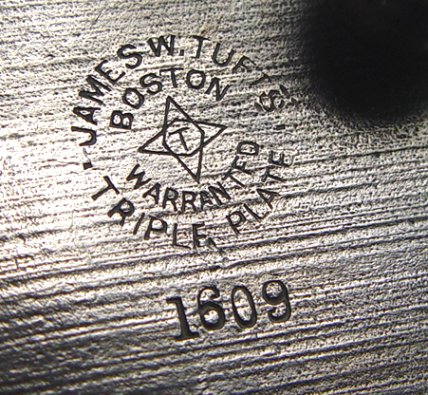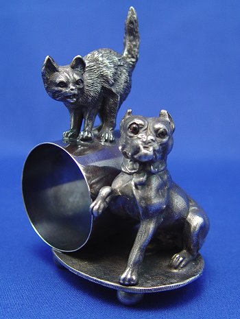 JAMES TUFTS CAT AND BULL DOG FIGURAL NAPKIN RING: Victorian silverplate. James Tufts of Boston hallmark. 4 1/4''h. x 3''.