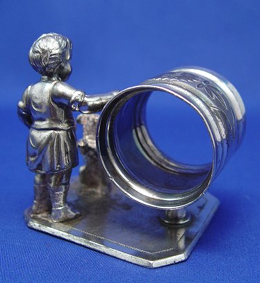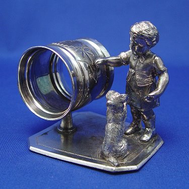 CHILD WITH DOG FIGURAL NAPKIN RING: Victorian silverplate, Aurora SPMFG Co. of Aurora Illinois hallmark. 3''h. x 3 1/2''.