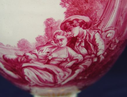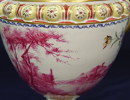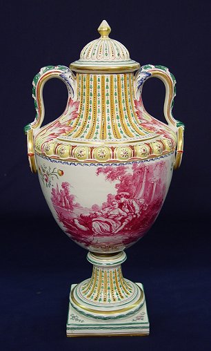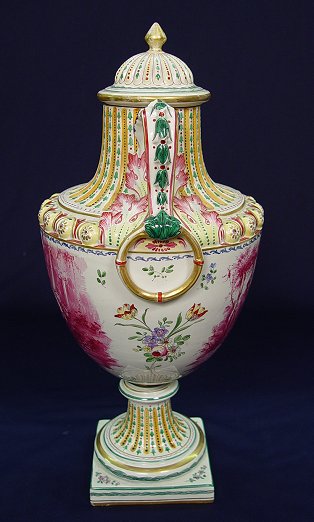 HAND PAINTED FRENCH FAIENCE URN: Hand painted, artist signed. Centering a monochromatic scenic landscape with polychrome decoration on the base, handle, and lid. Blue VP mark on the underside. 21''h. 11'' at the widest point. No chips or cracks.
