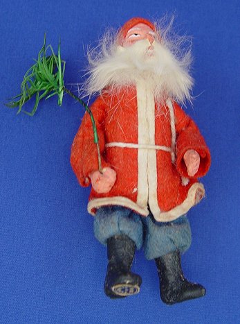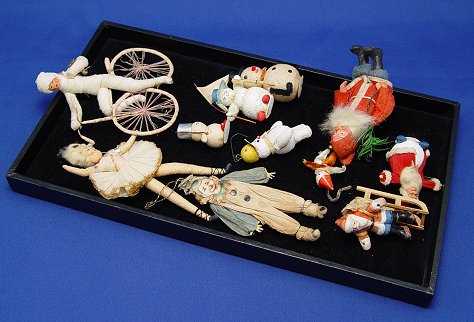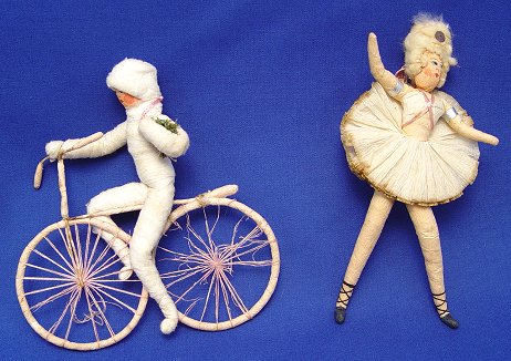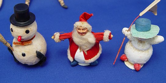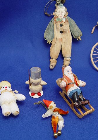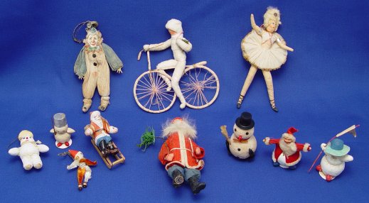 11 EARLY 20th C CHRISTMAS ORNAMENTS: Featuring a German Santa Clause figural gift box with removable head (5''h), a cotton batting bicycle rider(5''h), batting and crepe paper ballet dancer (6''), a tiny chenille clown, a 5'' crepe paper clown, 4 snowmen and a gesso Santa on sled.