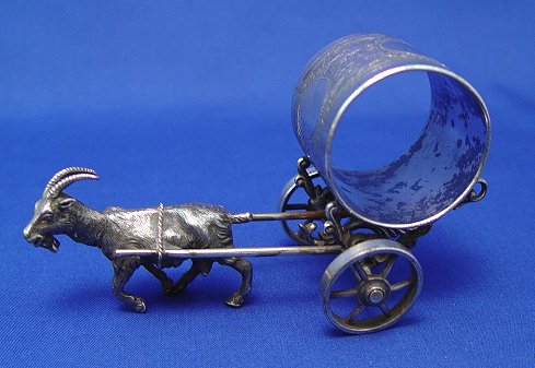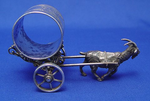 GOAT PULLING CART FIGURAL NAPKIN RING: Victorian silverplate, the goat is pulling the napkin ring. Meriden hallmark. 3''h. x 5 1/4''l.