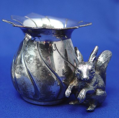 MERIDEN SILVERPLATED FIGURAL TOOTHPICK HOLDER: Long ear squirrel standing post at the toothpick vase. Meriden hallmark. 2 1/4''h.