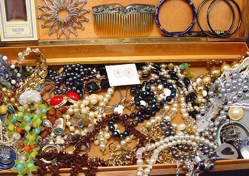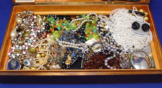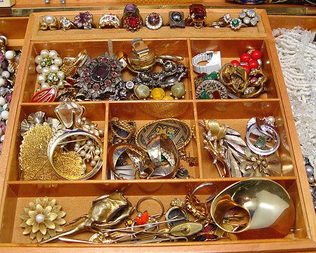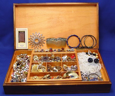 LARGE LOT OF ESTATE COSTUME JEWELRY: To include, vast assortment of vintage and newer costume jewelry. Many necklaces, pins, rings and earrings. Bohemian glass, cloisonne, Nacon lighter style perfume atomizer, Napier, Avon, Robert, Kofur, Flora Danica, sterling, and more. In a lovely box with interior tray and raised decoration to top,