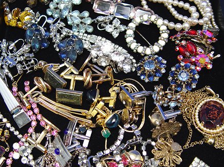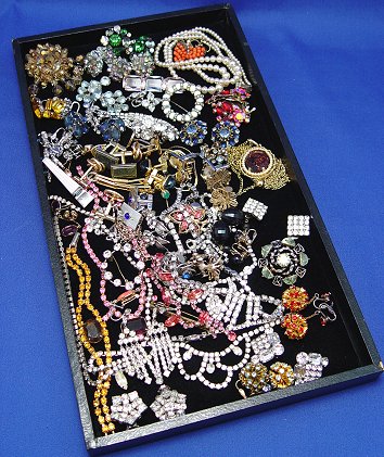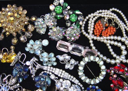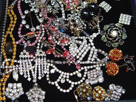 LOT OF ESTATE COSTUME JEWELRY: To include, clear and colored rhinestones, beads and cufflinks. Sparkling rhinestone items to include, necklaces, brooches, bracelets and many pairs of earrings - both clip and screw back. Clear, amber, red, pink, blue and green. Also, some bead jewelry, faux pearls, coral colored grape bunch dangle earrings. Cuff links and tie bars/tacks include, Krementz, Anson, Swank, and three 10k gold Federal Express Safe Driver pins. Great assortment sold as a lot.