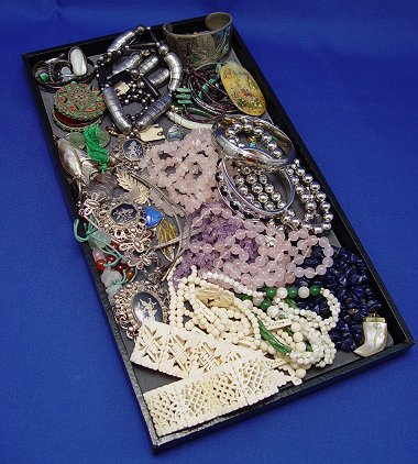 LOT OF ESTATE STERLING & STONE COSTUME JEWELRY: To include, carved bone panel stretch bracelets, carved bone necklace, fetish necklace, Mexican abalone cuff bracelet, abalone disk dangle earrings, Mexican sterling bangle bracelets, turquoise ring, bracelet and nugget necklace, amethyst, rose quartz adn blue stone necklaces, Siam sterling items, scenic painted shell pendant, sterling bead necklace. Etc, sold as a lot.