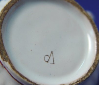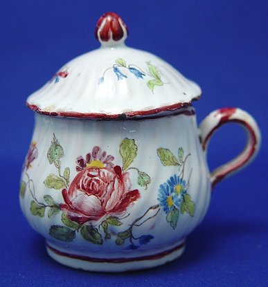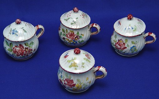 SET OF 4 FRENCH FAIENCE POTS DE CREME: 19th C hand painted covered custard cups. Marked with VP. Missed glaze spots and very minute chips along base.