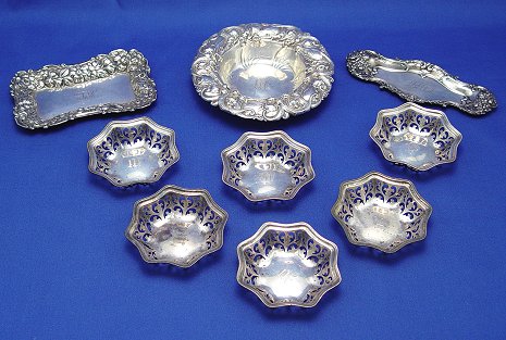 LOT OF DIMINUTIVE ESTATE STERLING BOWL & TRAYS: To include, Wallace floral repousse free form tray, 6 1/4'' x 2 1/2''; Whiting bowl with wide scrolling floral rim, #6194, overall 5 1/2''w, bowl 3 1/2''dia., 3/4''h.; Simons, Bro & Co rectangular tray with floral repousse edging, #221, overall 5 1/2'' x 3 1/2''; and a set of six Mandel Bros pierce side bowls, 3 1/2''dia., all monogrammed M?. Nine pieces sold as a lot.