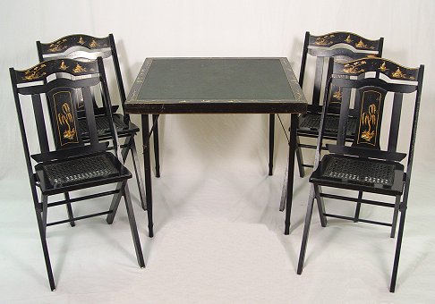 CHINOISERIE GAME TABLE AND CHAIRS: Black ground, set of 4 folding chairs and matching table. Table is 28''h. 30'' square.