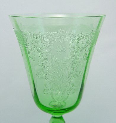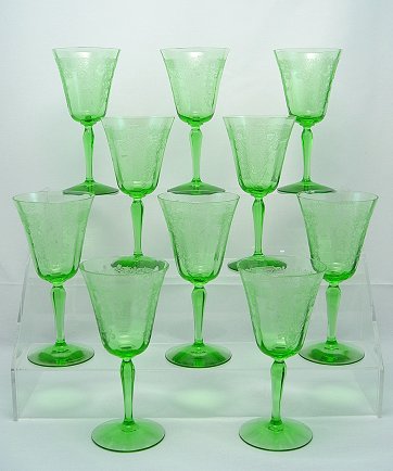 10 FOSTORIA ''VESPER'' GREEN GOBLETS: 7 1/4''h. 6 are in great condition, 4 have minor chips on the rim.