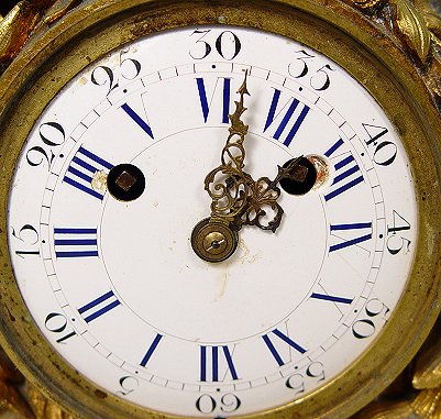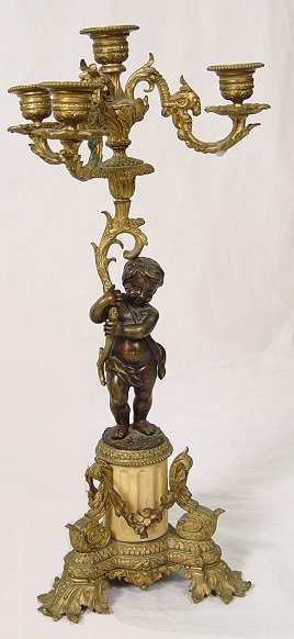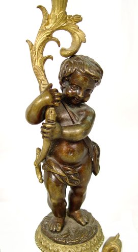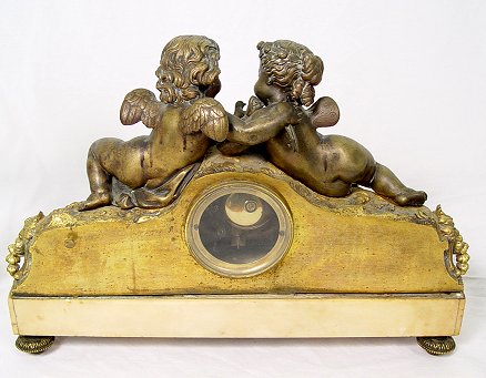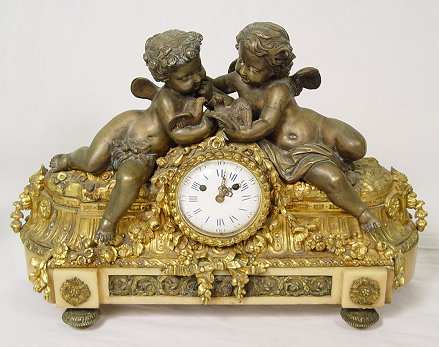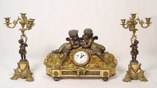 A JAPY CHERUB FIGURAL CLOCK GARNITURE: Clock is surmounted by bronze winged cherubs. Brass movement has script name ''Japy Fils''(?). Pair of 4 light candleholders, also with cherubs. 18''h. The clock is 14''h. x 22''w.