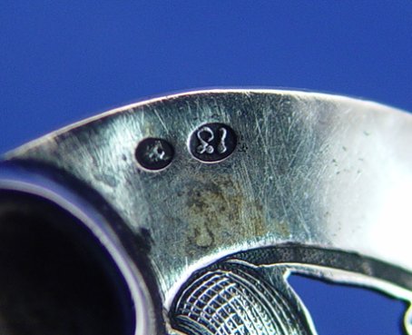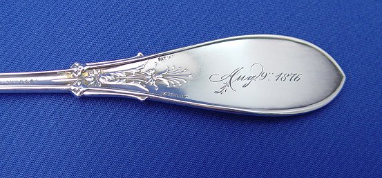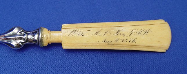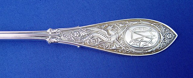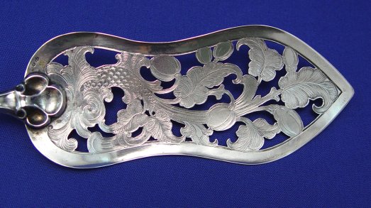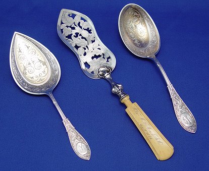 WHITING ''ARABESQUE'' SERVING SPOON AND SLICE PLUS A BONE HANDLED FISH SERVER: Rare Arabesue serving spoon and pie? server are 9''l. with bright cut design on vermeil bowls. Monogrammed GW., dated on the back Aug 9 1876. The fish server has a pierced open work blade with a dolphin design. The bone handle is inscribed to Mr. & Mrs. JBW Aug 9, 1876.