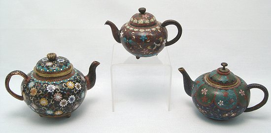 3 ADORABLE DIMINUTIVE CLOISONNE TEA POTS: Assorted floral patterns on black and maroon grounds, stepped in size from 3'' to 3 1/2'' to 4'' in height. Sold as a lot.