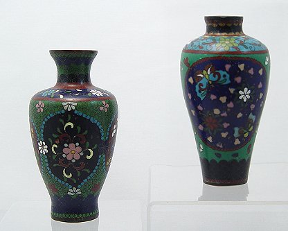 TWO BUTTERFLY DECORATED GOLDSTONE CLOISONNE VASES: Both with a butterfly motif, each in a different shade and coloration. 5''h. Chip to one.
