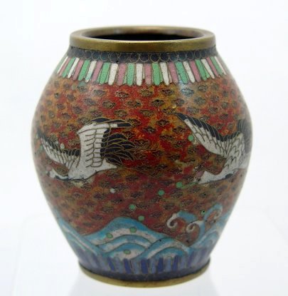 MINIATURE CHINESE CLOISONNE VASE: Flying Heron over waves, brown ground 3 1/4''h.