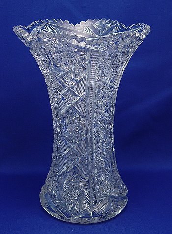 AMERICAN BRILLIANT CUT GLASS VASE: Excellent example of American period cut glass. Five designs including zipper, caning, hob star, and cross hatching or strawberry. No chips or cracks. 12 1/4''h. 8 1/2'' dia. at the flared rim.