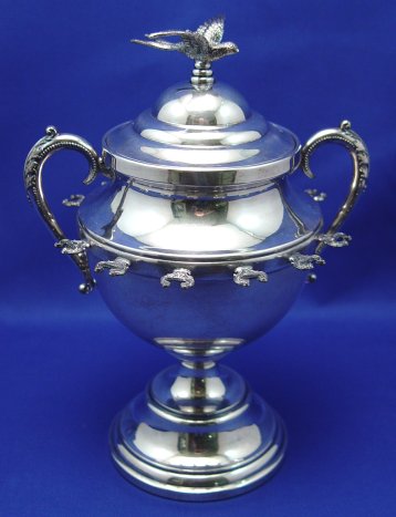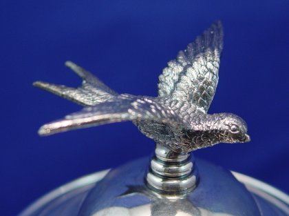 VICTORIAN SILVERPLATE SUGAR BOWL SPOON HOLDER: Forbes Silver Co. of Meriden Ct. 10'' covered sugar capped with a bird in flight finial. Holds 12 spoons.