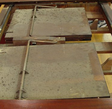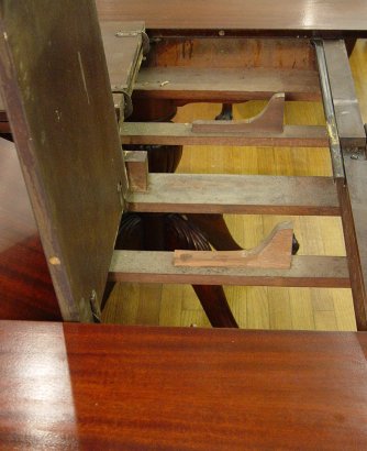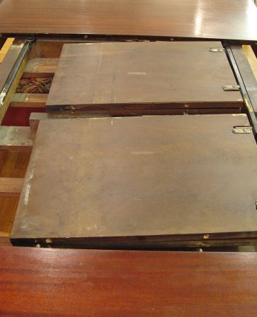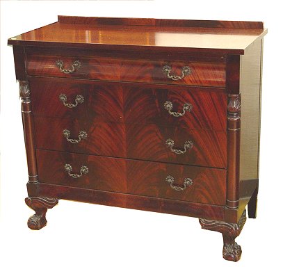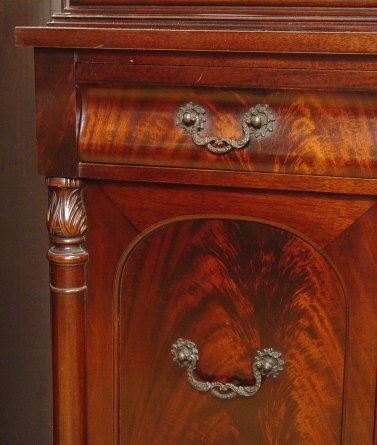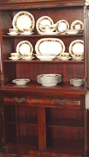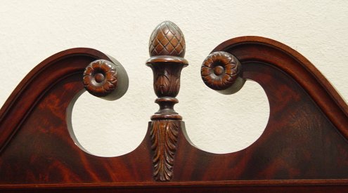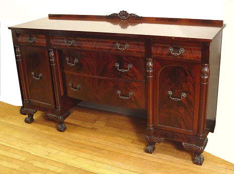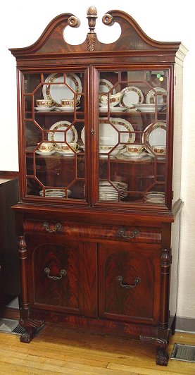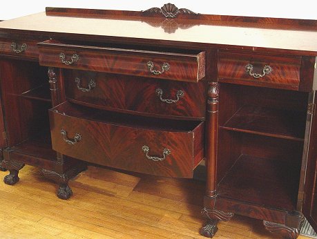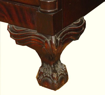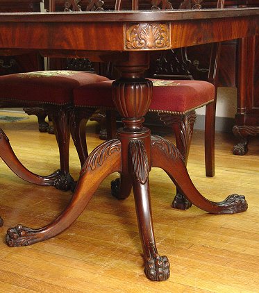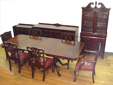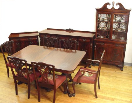 FABULOUS J.B. VAN SCIVER 10 PIECE MAHOGANY DINING SUITE: Finely detailed furniture featuring carved ball and claw feet on all pieces, columnar stiles on the cabinets, and pierce carved Chippendale style chairs with needlepoint seats. The set includes Double pedestal DINING TABLE with 2 hidden, self storing leaves (15'' each''), the table is 94''l with leaves in use. Set of 6 CHAIRS, one being an arm chair. CHINA CABINET has a pineapple finial and swan neck pediment over a glass front doors, over drawer and cabinet base (76''h. x 36'' x 16''). Bow center SIDEBOARD (37 1/2''h. x 68'' x 22'') has three drawers across the top, two are felt lined silver drawers, the center drawers are bowed, the cabinet sides have interior shelves. The four drawer SERVER is 33 1/2''h. x 38'' x 17 1/2''.