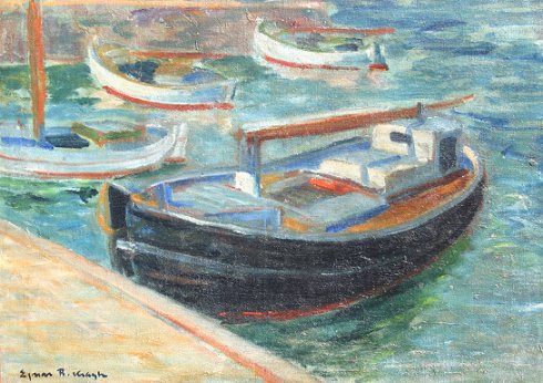 KRAGH, Ejnar, (Danish, 1903-1981): Dockside harbor scene, O/C, 30 3/4'' x 43 1/2'', signed lower left, encased in later frame which needs replacement. Condition - Needs cleaning, patch visible verso.