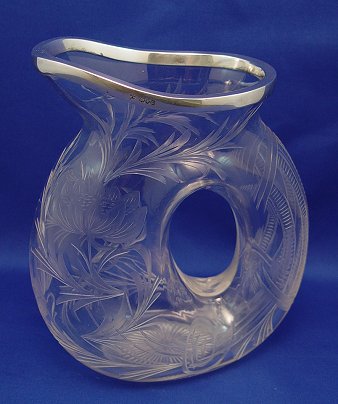 STERLING MOUNTED CUT CRYSTAL PITCHER: A most unusual shape, with open center as the handle. Cut in a floral and zipper design. The sterling mount bears 1907-1908 English hallmarks. 9''h. No chips or cracks.