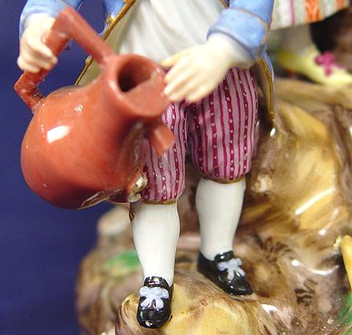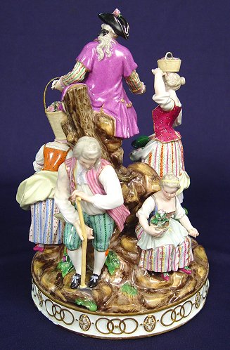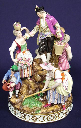 MEISSEN FIGURAL GROUP: Six highly detailed figures, each engaged in a garden activity. Circular base is 8'' dia., figures are visible from all sides. Please note loss of handle to jug, several leaf tips are gone and there is a about a 1'' long area of roughness on the base. 11 1/2''h. Figures are approx. 6''h. Blue cross sword marks.