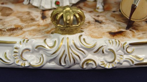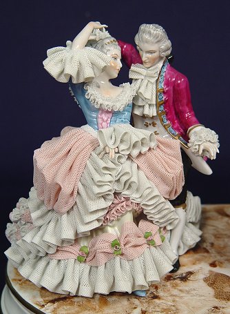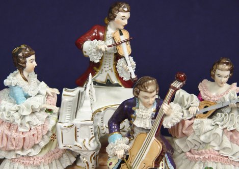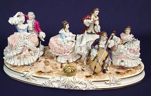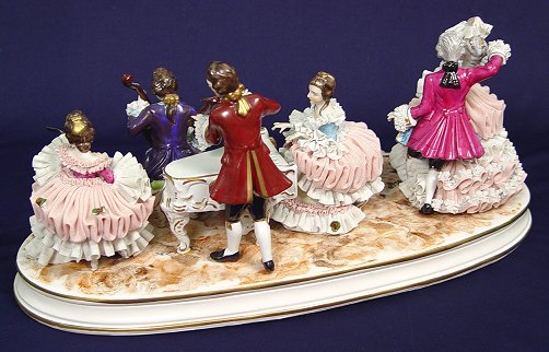 MULLER GERMAN PORCELAIN LACY FIGURAL GROUP: Six musician and dancing figures. The lacy dresses are intact. Large oval base with faux marble surface. Figures are approx. 6''h. The piece is 8 1/2'' x 20'' x 9'' overall. Bears the hallmark for Muller & Co. Volkstedt, Thuringa Germany.