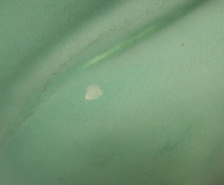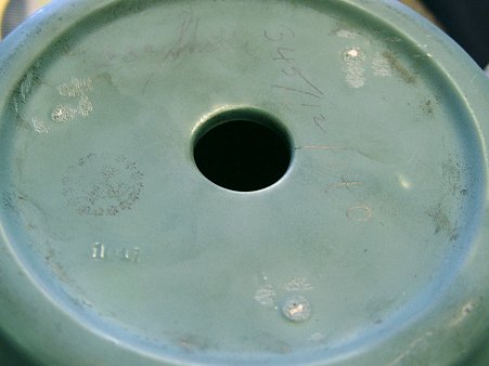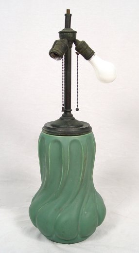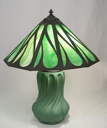 A GRAND ARTS AND CRAFTS ERA ART POTTERY LAMP: Teco type pottery base. Note the slag glass shade has the same elongated drop design as the pottery. Illegible stamp on the base. Lamp is 27''h. The shade is 21 1/2'' dia. Est. $800/1200**