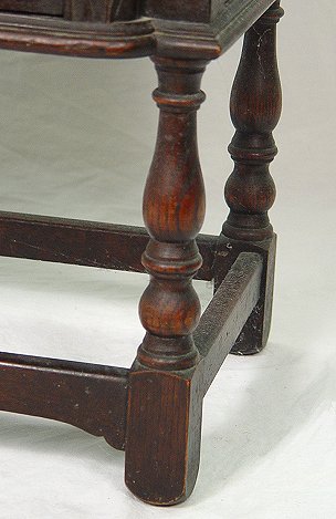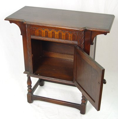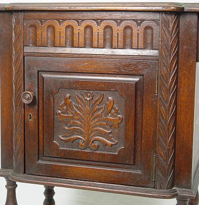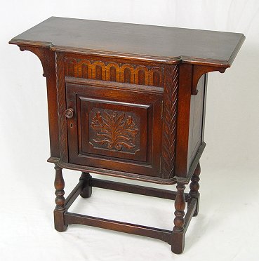 JACOBEAN REVIVAL CARVED OAK STAND BY H. KRUG OF ONTARIO: Overhanging top. Relief carving on the one door. 30 1/2''h., x 30''w. Bears the Krug label.