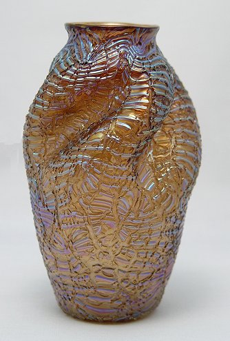 LOETZ FORMOSA ASTGLAS VARIANT: Ca. early 1900's. Amber glass covered in raised iridized threads. Twisted form. 7''h. Unsigned. No cracks or chips.