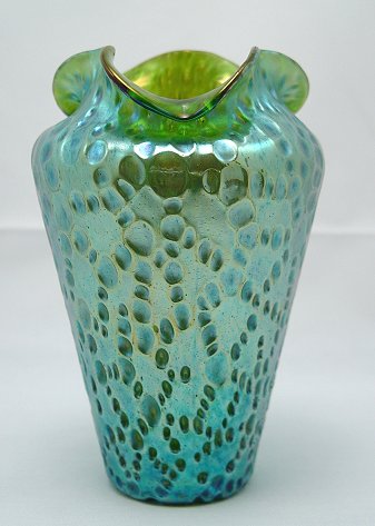 LOETZ DIASPORA BOHEMIAN ART GLASS VASE: Ca. early 1900-1905. Green iridised glass in the Diaspora decor. 7 1/4''h. approx. 4 1/2'' dia. Unsigned. No chips or cracks.