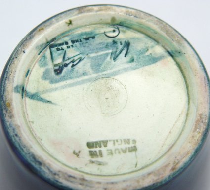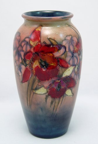 MOORCROFT ART POTTERY VASE IN AN ORCHID DESIGN: The ground is rose to blue. Polychrome decoration. Painted Moorcroft signature, ''Made in England Potter to the Queen''. 7 1/2''h. No chips or cracks. Est. $450/600**