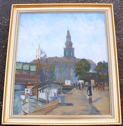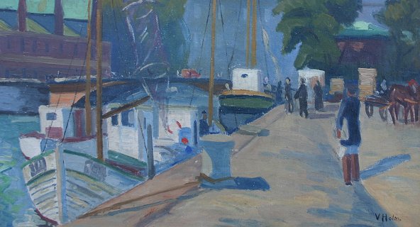 HOLM, V, (Danish, 20th C): Dock scene with figures, O/C, 29 1/4'' x 25 1/4'', signed lower right, encased in gilded molding, 33 1/2'' x 29 1/2''. Condition - Several minor flecks of paint loss, 2'' repaired tear in canvas bottom margin, needs cleaning.