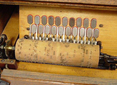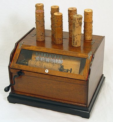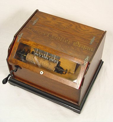 OAK BARREL OR ROLLER ORGAN WITH 8 CYLINDER ROLLS: Hand crank cylinder music player in table top oak case with hand stenciled gold design and ''Concert Roller Organ'' stenciled onto the top. Approx. 12''h. x 14'' x 17''. Good working order.