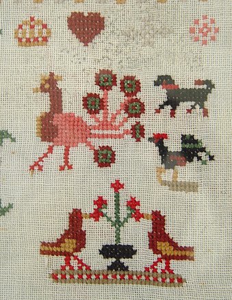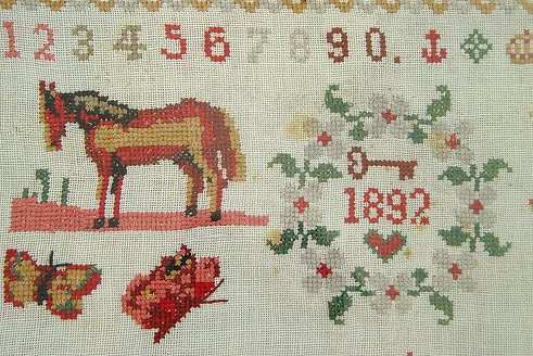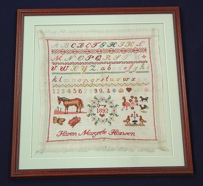 HAND SEWN SAMPLER DATED 1892: Worked by Karen Margrete Hansen (?). Alphabet and numbers with the date 1892 centered in a wreath. Also shows images of a horse, butterflies, dog, rooster, and the traditional key, heart, crown, and anchor symbols. Worked in red, brown, pink and green on a fringed cloth. Recently framed and matted under glass. The cloth is 15'' x 16''. The frame is 22'' x 21 1/2''.